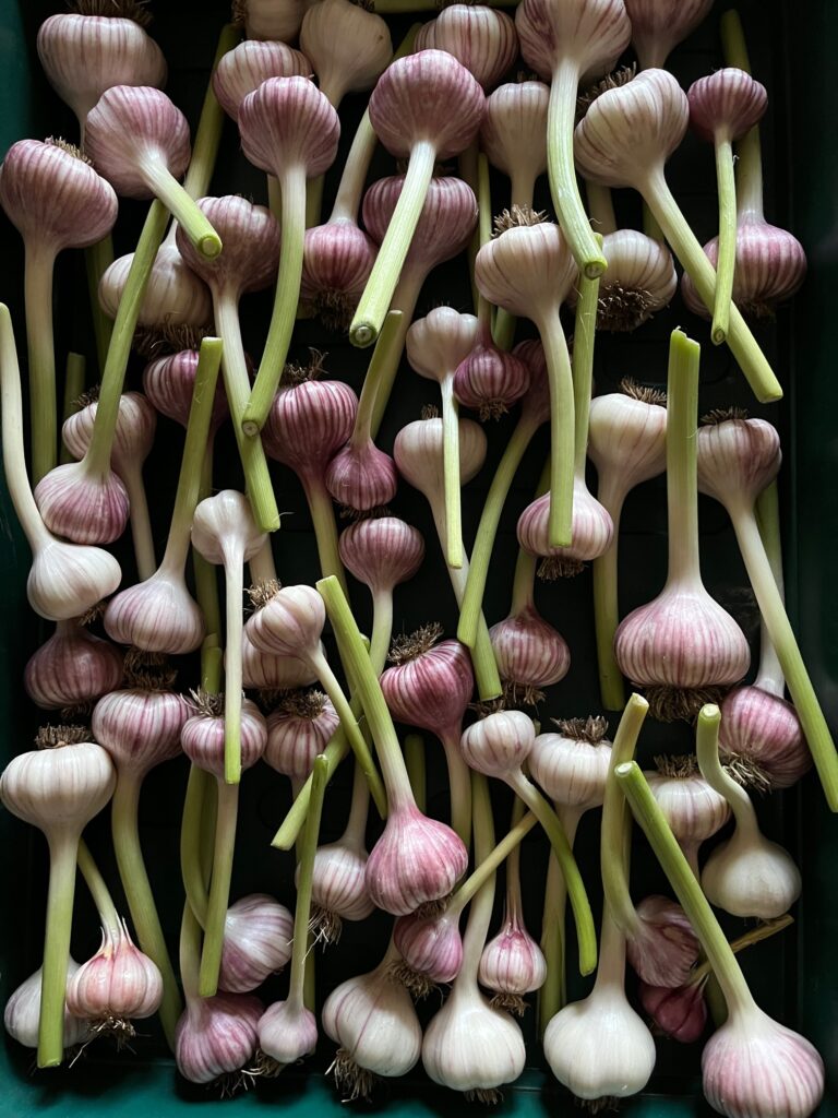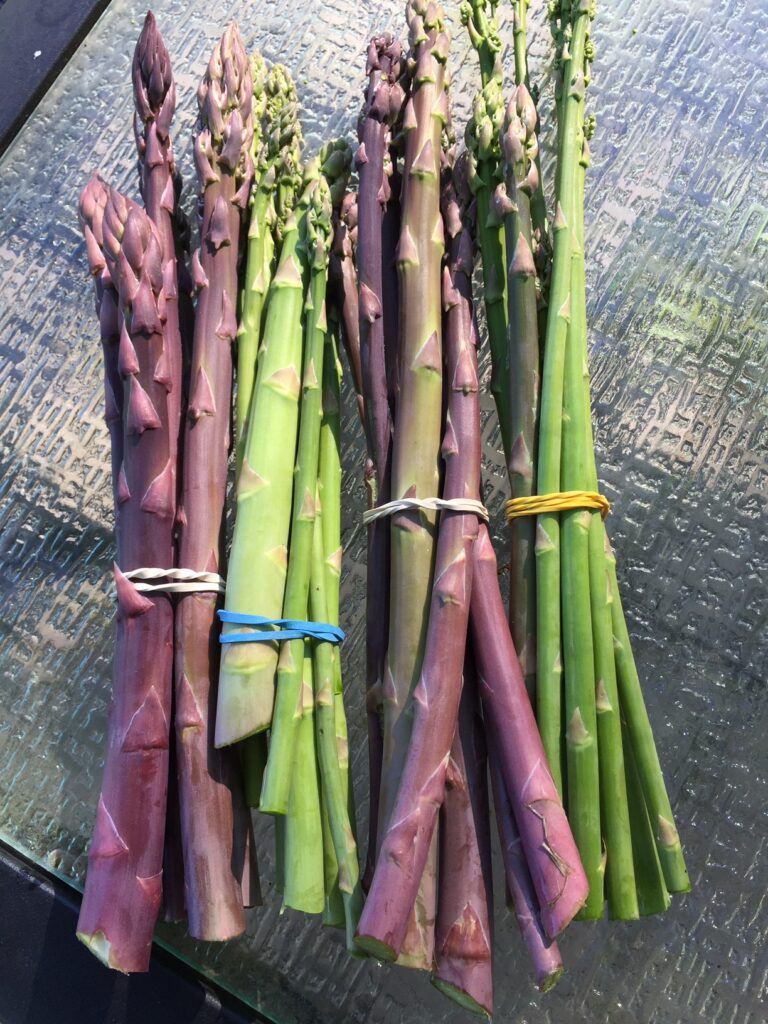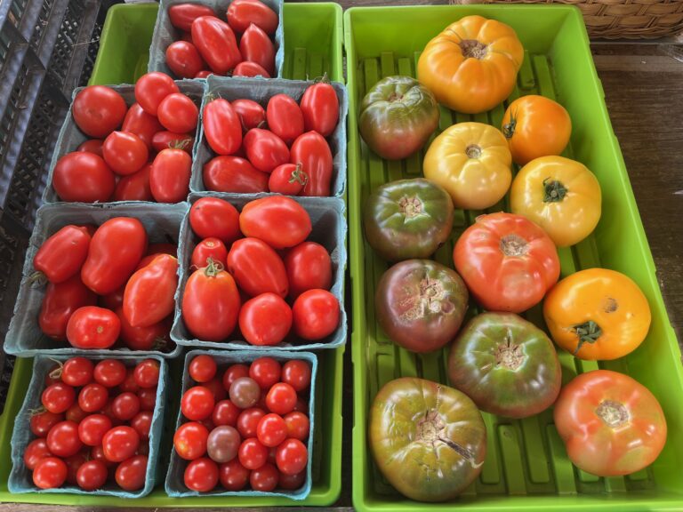 We grow apples, arugula, asparagus, beans, beets, bok choi, broccoli, brussels sprouts, cabbage, carrots, cauliflower, celery, cucumbers, eggplants, fennel, garlic, herbs, honeydew, husk cherries, lettuce, onions, peaches, pears, peas, peppers – sweet and hot - potatoes, pumpkins, radishes, rhubarb, romaine, summer squash, scallions, spinach, strawberries, sweet potatoes, turnips, tomatoes, tomatilloes, zucchini, and watermelon.